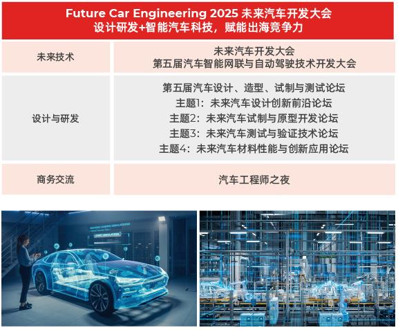 Future Car Engineering 2025未來汽車開發(fā)大會(huì)將聚焦智能網(wǎng)聯(lián)與自動(dòng)駕駛技術(shù)、汽車設(shè)計(jì)、造型、試制與測(cè)試等核心的前沿技術(shù)與解決方案,匯聚全球汽車設(shè)計(jì)研發(fā)領(lǐng)域的精英,打造一場(chǎng)技術(shù)、生態(tài)、商業(yè)深度融合的國際盛會(huì),預(yù)計(jì)將吸引1,000名中國及500名來自