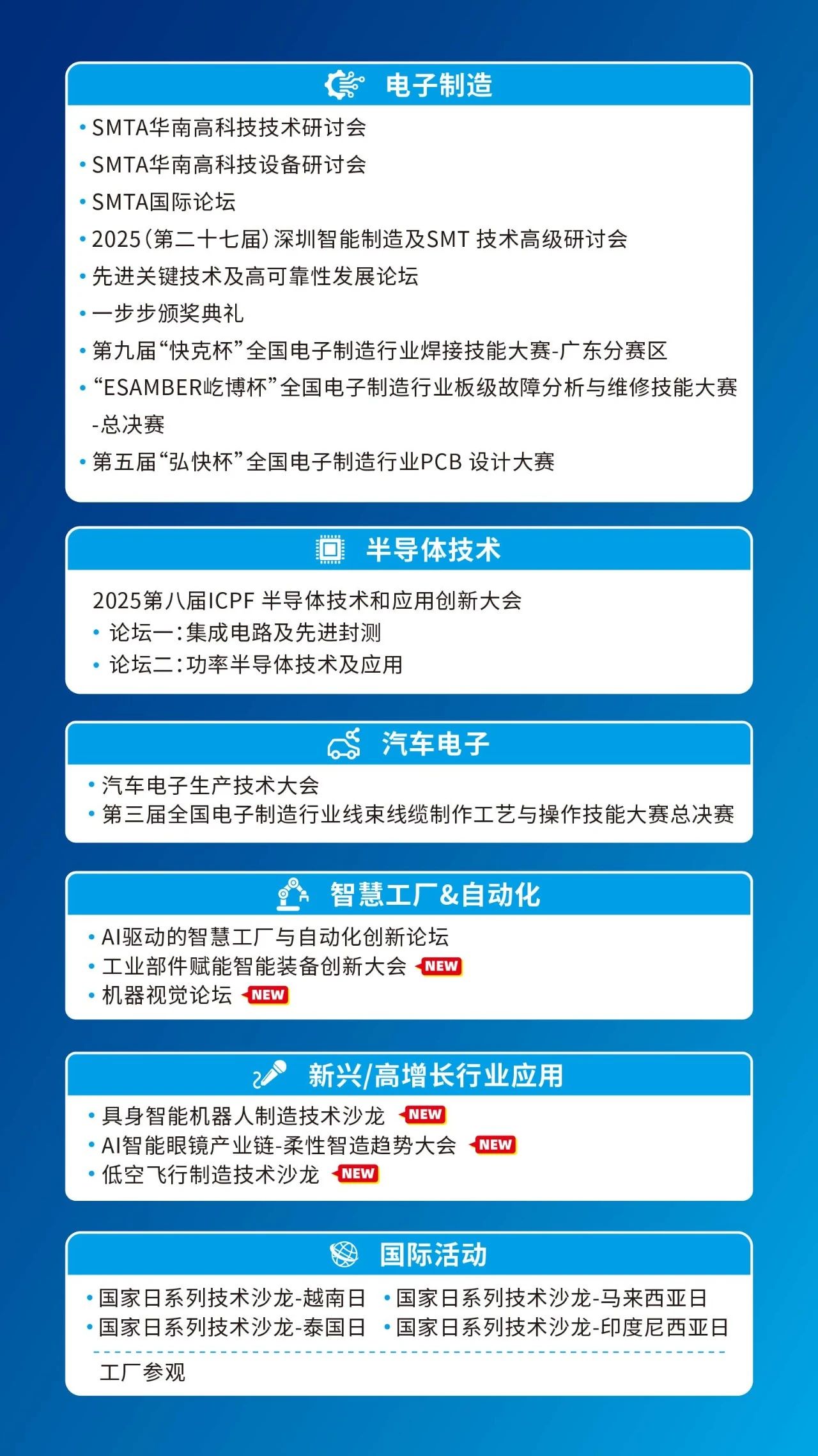 在AI終端、圖像傳感、半導(dǎo)體芯片等關(guān)鍵領(lǐng)域持續(xù)領(lǐng)跑,成功實(shí)現(xiàn)技術(shù)創(chuàng)新與多場(chǎng)景應(yīng)用的深度融合。NEPCON ASIA 2025針對(duì)具身智能機(jī)器人、低空飛行、智能工廠、機(jī)器視覺、半導(dǎo)體、電子制造等領(lǐng)域開展40場(chǎng)會(huì)議論壇及賽事活動(dòng),深度整合國(guó)內(nèi)外行業(yè)協(xié)會(huì)組織、專家、科研人員、資深從業(yè)者、行業(yè)應(yīng)用終端及行業(yè)媒體等資源,探討電子制造現(xiàn)狀與未來發(fā)展趨勢(shì),實(shí)現(xiàn)業(yè)務(wù)的持續(xù)增長(zhǎng),共同拓展市場(chǎng)新未來!
