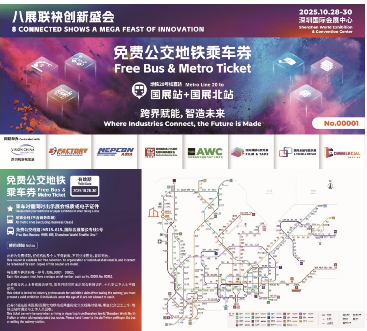 主辦方在開展期間特別為前來展會的參展商和觀眾提供免費公交地鐵乘車券,憑您的“2025亞洲工業(yè)科技展 ”任一展會的展商證或參觀證領(lǐng)取,每人每天限領(lǐng)2張,當日領(lǐng)完為止。